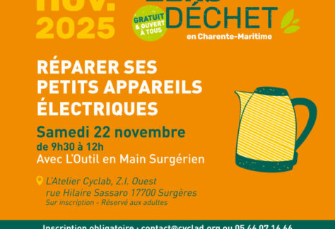 Du 22 au 30 novembre 2025, c’est la Semaine Zéro Déchet ! Dans le cadre de la Semaine Européenne de la Réduction des Déchets, le service public Cyclad propose 4 rendez-vous pour réduire ensemble nos déchets. SAMEDI 22 NOVEMBRE 2025 Atelier « Café réparation » avec L’Outil En Main à SurgèresDe 9h30 à 12hApportez votre petit appareil électrique à…