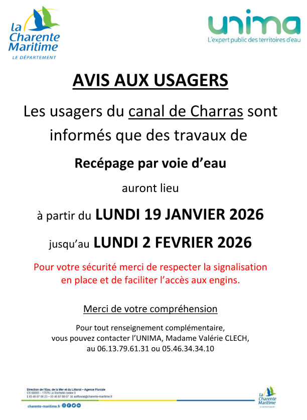 Les usagers du canal de Charras sont informés que des travaux de Recépage par voie d’eau auront lieuà partir du LUNDI 19 JANVIER 2026jusqu’au LUNDI 2 FEVRIER 2026 Pour votre sécurité merci de respecter la signalisationen place et de faciliter l’accès aux engins. Merci de votre compréhension Pour tout renseignement complémentaire,vous pouvez contacter l’UNIMA, Madame…