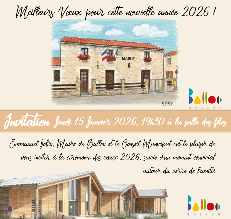 ✨Vous êtes invités aux vœux du maire ce jeudi 15 janvier 2026 !✨Par mairie / 13 janvier 2026 Rendez-vous à la salle des fêtes de Ballon à 19h30. La cérémonie des voeux sera suivie d’un moment convivial🍹 Facebook Twitter LinkedIn Email Imprimer