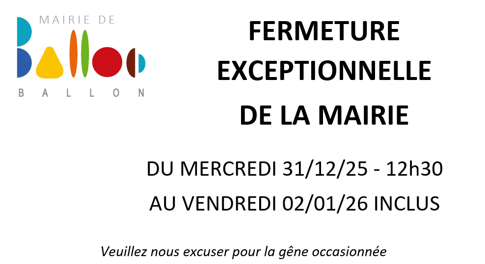 La Mairie vous informe que les services techniques et administratifs seront exceptionnellement fermés du 29 décembre 2025 12h30 au 2 janvier 2026 inclus. Nous vous remercions de votre compréhension. En cas d’urgence, uniquement : 07.44.63.59.23