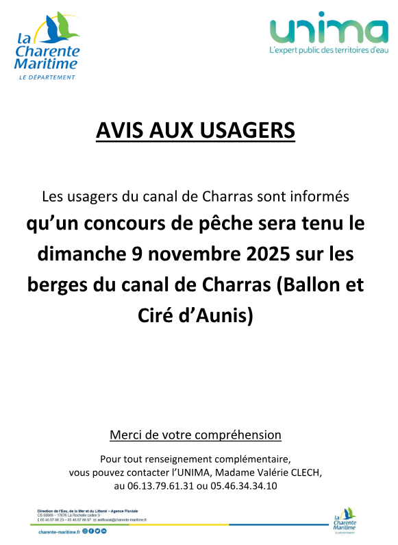 Les usagers du canal de Charras sont informés qu’un concours de pêche sera tenu le dimanche 9 novembre 2025 sur les