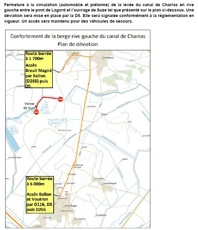 ARRETE DU DEPARTEMENT DE LA CHARENTE-MARITIME : https://www.mairie-ballon.fr/wp-content/uploads/2025/12/AOT-Interdiction-de-circuler-pour-travaux-confortement-de-berges.pdf