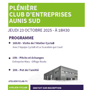 Le Club des Entreprises Aunis Sud a le plaisir de vous inviter à sa prochaine plénière dont vous trouverez ci-dessous le programme. Cette rencontre est ouverte aux entreprises non encore adhérentes. 23 OCTOBRE– 18h30 – PLÉNIÈRE DU CLUB D’ENTREPRISES AUNIS SUD Ouvert aux clubs d’entreprises partenaires et aux entreprises non adhérentes Les transitions comme leviers […]