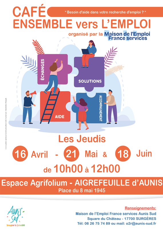 La maison de l’emploi Aunis sud organise des cafés « Ensemble vers l’emploi » à l’espace Agrifolium à Aigrefeuille-d’aunis.