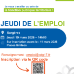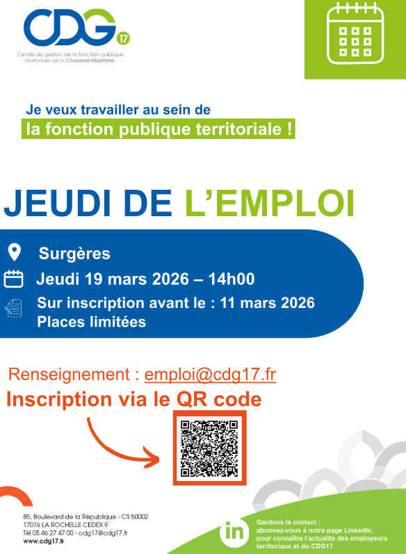 Le Centre de Gestion organise une réunion d’information « Jeudi de l’emploi » sur la fonction publique territoriale et ses opportunités de recrutement le jeudi 19 mars 2026 à 14h00 à Surgères (le lieu exact sera précisé aux participants quelques jours avant la réunion).