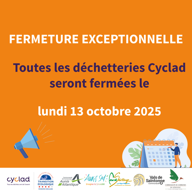 Aussi, toutes les déchetteries de Cyclad seront exceptionnellement fermées le lundi 13 octobre 2025.