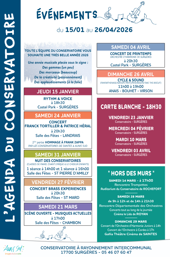 L’agenda du Conservatoire de l’AUNIS SUDPar mairie / 13 janvier 2026 Facebook Twitter LinkedIn Email Imprimer