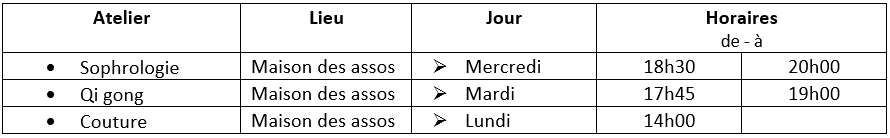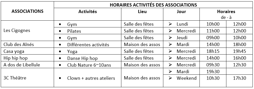 Nos associations y sont présentes (certaines activités ont lieu dans la salle des fêtes) :